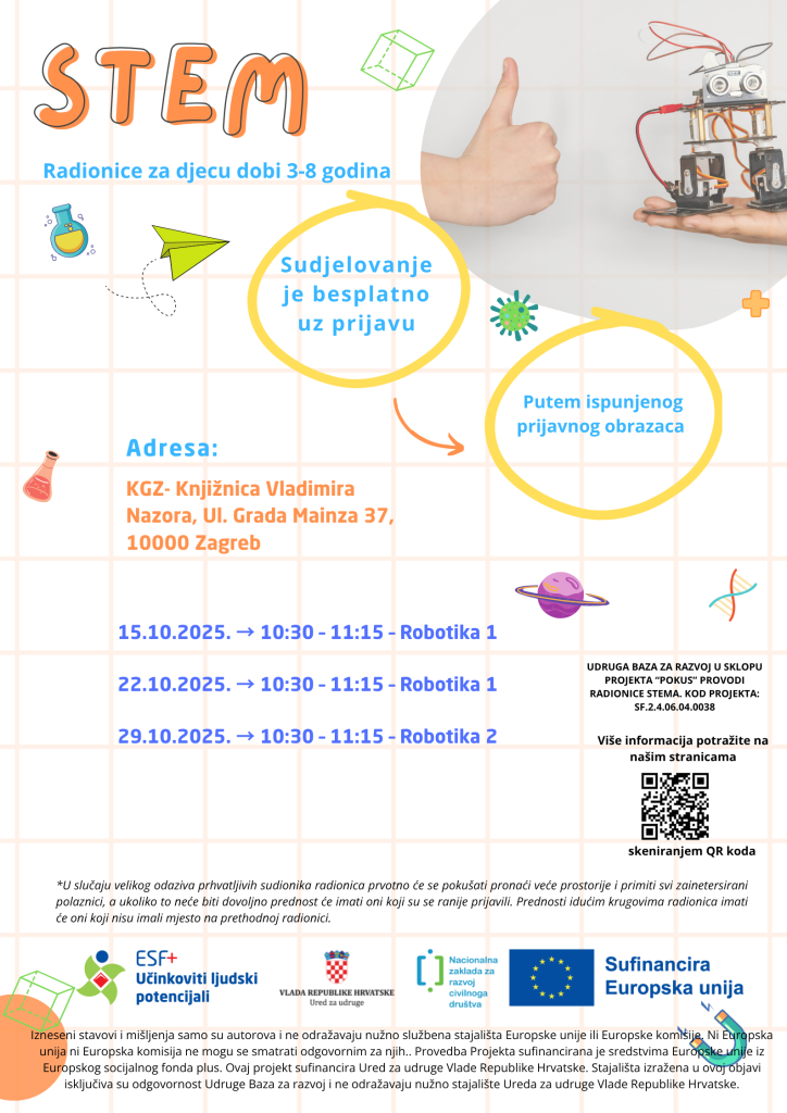 Udruga Baza za razvoj poziva djecu i roditelje na STEM radionice koje će se održavati u listopadu, studenom i prosincu 2025. godine u KGZ- Knjižnica Vladimira Nazora, Ul. Grada Mainza 37, 10000 Zagreb.
